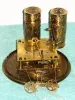 C.1870, German, Gustav Becker, 2-Wt, Vienna Regulator, 8-day, in a "double door" style case, and melodious rod strike. Condition: the old carved top on this clock is from another piece of furniture, doweled to fit this case, otherwise the clock is original. The well made Becker movement, serial No. 467402, has been cleaned and re-strung and seems to be running fine. Note the dial center, weights and pendulum all have the same embossed brass pattern. The case has a couple of dry/age splits. Height 45 inches