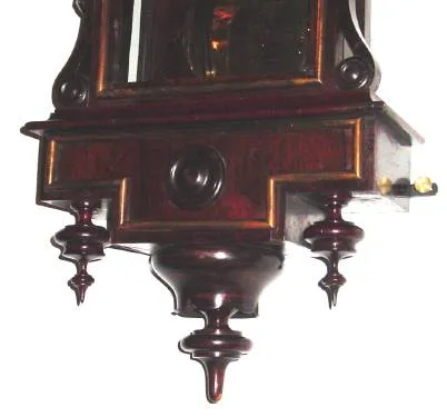 Condition: this is a nice clock out of a home near Augusta, ME, and shows evidence of good care. Best part is the large double curved dial, 9" in diameter with robust Roman numerals fired into the porcelain, and the stylish over-size brass hands. Movement has Lion trademark with "UM" beneath, that Muller used after taking over Schneckenbergers in 1900. Height 18.5 inches [47cm]