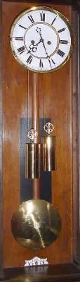 C.1875, Austrian, 2-Wt, Vienna Regulator, 8-day, in a walnut case with old top and finials. Condition: other than the old top is from another clock, and the left click spring is broken, this is a good original clock. Has a good Viennese bench made movement and no extra holes in case. The porcelain dial is good, with a spider crack near 5. Hands appear to be original. Pendulum has a small dimple in the very center; weights are good. Height 50 inches [127cm]