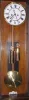 Condition: other than the old top is from another clock, and the left click spring is broken, this is a good original clock. Has a good Viennese bench made movement and no extra holes in case. The porcelain dial is good, with a spider crack near 5. Hands appear to be original. Pendulum has a small dimple in the very center; weights are good. Height 50 inches [127cm]