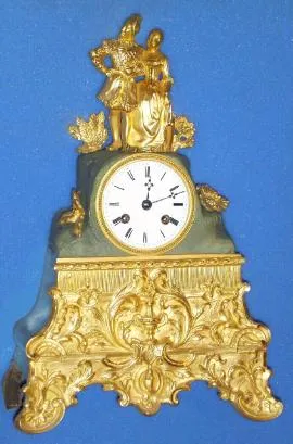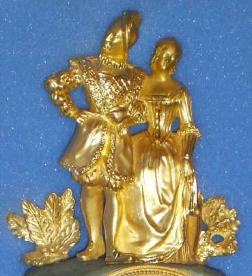 C1840, French, Ormolu and Bronze figural clock, a courtesan and his lady, in formal dress, the well made bell strike movement with silk thread suspension. Condition: overall excellent original condition, recently cleaned and in good running order. Perfect porcelain dial and original hands. If sold in a French decorative arts sale, a nice clock like this would fetch $1500. Height 13.5 inches [34cm]