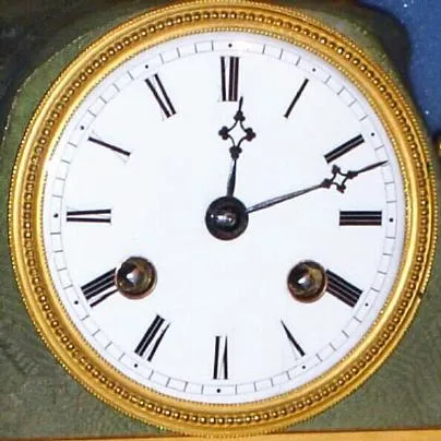 Condition: overall excellent original condition, recently cleaned and in good running order. Perfect porcelain dial and original hands. If sold in a French decorative arts sale, a nice clock like this would fetch $1500. Height 13.5 inches [34cm]