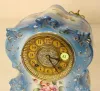 Gilbert No. 417 china case clock: blue decorated with violets; works patented 1881. (Case chip under back door; no other condition problems.) Not Running. 10 3/4" T