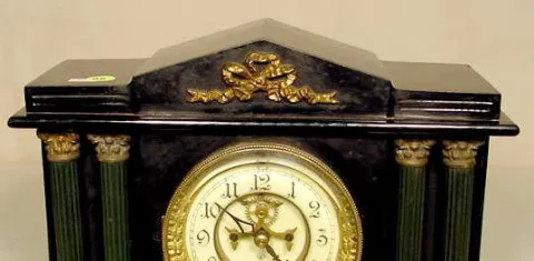 Last Pat. 1882; open escapement; porcelain dial. (Minor finial chips & losses; needs a new pendulum hanger.) Not running. 11 3/4" T x 14 3/4" W ...