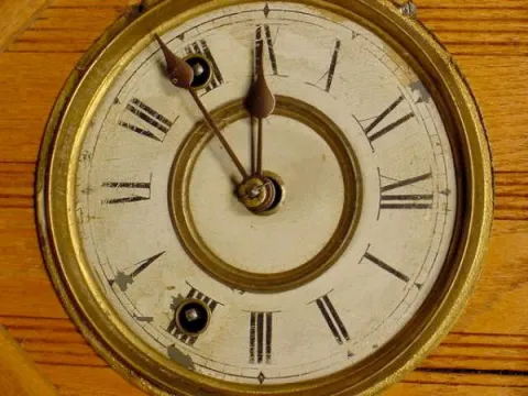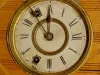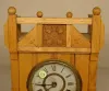 Oak shelf clock: time & strike. (Completely stripped; some dial paint losses.) Running at the time of listing, not guaranteed to continue. 16" x 11" W