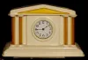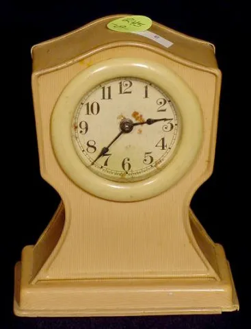 Collection of 8 celluloid case clocks: a variety of styles and works manufacturers; most cases basically in good condition. (A couple with small losses, wear & discoloration; a couple with missing winding keys.) Some are running, some are not. 2 3/4" T to 6" T