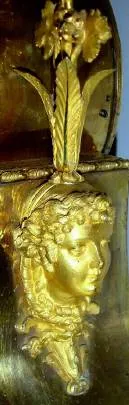 C.1820, French, Ormolu Clock with original dome and base, case depicts a goddess receiving grapes from a cherub, and swags of grape vine with clusters of grapes, all "growing" out of an urn at top.. Condition: overall excellent original condition, dial with very minor hairlines; original hands, bell and great gilt finish. Retains all 4 original turned feet. Movement is larger size typical of early 19th century, is clean and running. From Blackwell music room. Ht of clock 19" with dome and base 21"