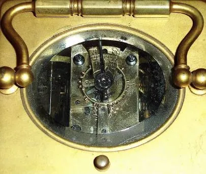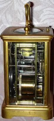 C.1900, French for Bailey Banks and Biddle, Philadelphia, brass cased carriage clock, time, strike and repeat in a Corniche case. Condition: running and striking with original platform intact. Case retains original gilding, with some nicotine fogged over (don't rub to clean). Left beveled glass has a chip top corner, balance of glass is good. Porcelain dial is nice and with original retailer [as in headline] showing below 6. Height 6.5 inches