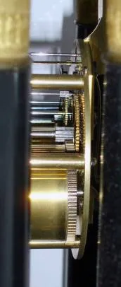 Condition: Dana had nicely cleaned and polished this movement and it was running upstairs. There is no signature nor number on the bell strike movement. Nice engine turned dial retains original gilding and nice cast bezel and pendulum. Way above average for this style of clock. Ht of clock 20", with dome and base 25"