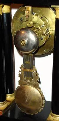 C.1870, French, 4-Column Empire style mantel clock with base and repaired glass dome. Condition: the dome has a large section glued back in; the display base has veneer lifting and some losses; gilding distressed one foot replaced. Clock is generally sound, the movement recently cleaned and in running order. Engine turned dial retains original silvering and numerals and the gilt bezel and pendulum are still brilliant. Ht of clock 18", with dome and base 24"