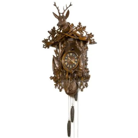 late 19th century, elaborately carved with dead game, a hunting pouch, and oak branches and leaves, with a crest featuring a stag head and crossed ri...
