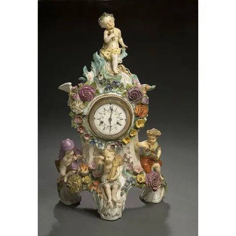 late 19th century. Case is porcelain after a Meissen model, with underglazed blue faux-crossed swords mark; heavily encrusted with flowers, modeled w...