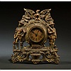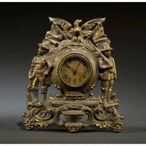 unmarked fixed key wind, 8-day spring-driven brass movement with printed paper dial with Arabic numerals, bronzed cast iron case with spread-winged e...