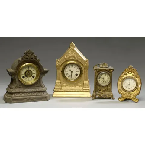1st is gold-painted pottery in the form of a peaked building, with original printed paper label on back Regina Clock Co. Boston, Mass., time only, 6" x 8.5", PLUS a cast iron example with original printed paper label on back, Terry Clock Co., time and strike, spring-driven, 6.75" x 7.75", PLUS unmarked Art Nouveau cast brass with gilt and cello dial, carriage clock style, 3.75" x 5.4", AND a marked New Haven cast gilt brass floral cased clock with seconds dial, time only, 3.5" x 5.75". Condition report 1st-3rd not running, 1st repaint; 4th running intermittently, all with minor wear to dials and cases.