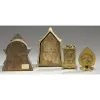 Four Metal-Cased Novelty Clocks, 1st is gold-painted pottery in the form of a peaked building, with original printed paper label on back Regina Clock Co. Boston, Mass., time only, 6" x 8.5", PLUS a cast iron example with original printed paper label on back, Terry Clock Co., time and strike, spring-driven, 6.75" x 7.75", PLUS unmarked Art Nouveau cast brass with gilt and cello dial, carriage clock style, 3.75" x 5.4", AND a marked New Haven cast gilt brass floral cased clock with seconds dial, time only, 3.5" x 5.75". Condition report 1st-3rd not running, 1st repaint; 4th running intermittently, all with minor wear to dials and cases.
