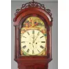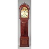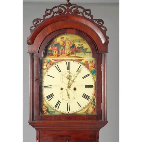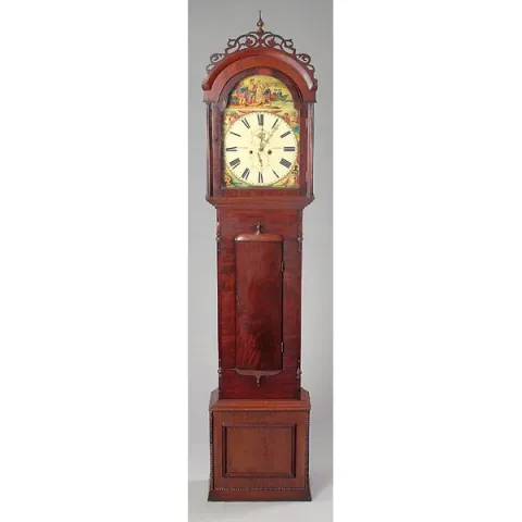 mahogany with pine secondary wood. Arched top bonnet has scroll-cut fretwork and central turned finial. Waist with canted quarter columns with half turned drops at top and base. Bow front waist door has matching molding at top and base with half turned finials. Clock base has modified egg & dart type molding at sides and cove molding in front, and at foot and top. Polychrome painted arch top dial with "Jos: Dilger" and "Glasgow." Time and strike with calendar dial and second hand dial, ornate pierced brass hands, typical British bell strike movement. Painting at corners of face are of various ethnic peoples and in arched top of Scottish nobility welcoming Queen Mary from France. Iron pendulum with gilt floral scrollwork over black decoration. Nice old finish with rich color; 90" high.Condition:VG+, was working in house when picked up, very slight wear to base molding.