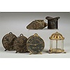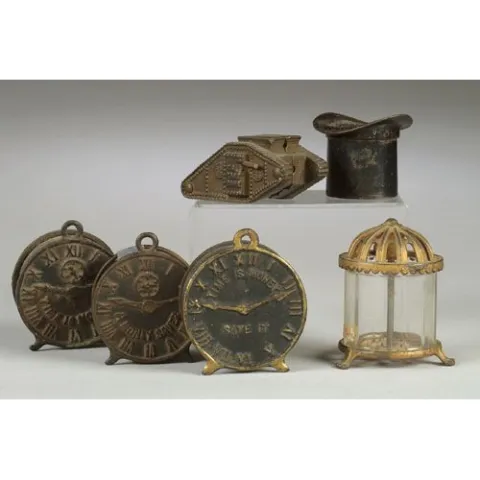 lot of 6, includes Time is Money alarm clock in original black and gold paint, ca 1910-30, by A.C. Williams; 3" diameter x 1.75" thick; PLUS A Money Saver alarm clock in original black and gold paint, ca 1910-20, by Arcade; 3" diameter x 1.8" thick; PLUS a third alarm clock not in Moore's book entitled Save It marked on rear The/Ohio Foundry Co/Cleveland/Ohio in original black and gold paint, age?; 3.2" diameter x 1.6" thick; PLUS U.S. Tank Bank, in olive green finish, ca 1919, designed by N.T. Hasenplug; 4" long x 2.25" wide x 2" high; PLUS Lincoln High Hat (Pass Around the Hat) in original black paint, unattributed American; 3" long x 2.5" wide x 2.25" high; AND Crystal Bank with paneled clear glass center and open CI top and base in original gold paint, ca 191-20, by Arcade; 2.75" diameter x 3.75" high.1st paint approx. 80%, VG; 2nd missing screw and paint approx. 90%, VG; 3rd paint approx. 90%, VG; 4th missing center barrel, else VG; 5th paint approx. 85%, VG; 6th paint approx. 90%, VG.