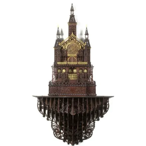 mahogany Victorian or Edwardian band saw cut with towering spires, galleries, balustrades, gates and more with inset clock in tower with some gilt highlights; 10.25" deep x 19.75" wide x 40" high. Includes an equally outstanding fretwork shelf with ghost on plate where the cathedral sat for decades; 16" deep x 34.5" wide x 21" high. Total height with cathedral sitting atop its shelf is 61" high. We know of two other nearly identical to this piece, except that they lack the stand. One is in the F.D.R. Library & Museum in Hyde Park, N.Y. Some minor repaired breaks as expected, and clock movement has been replaced with a battery mechanism, else EXC.