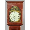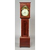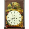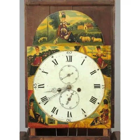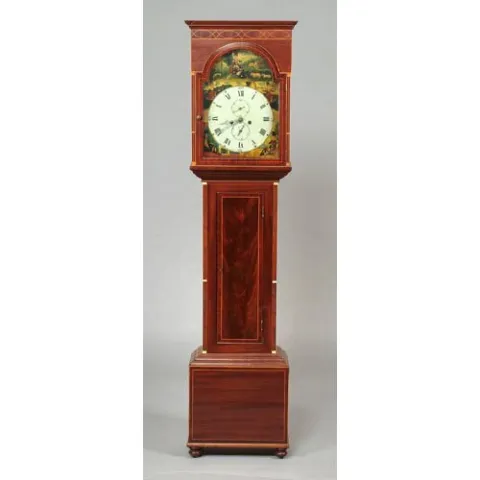 mahogany and mahogany veneer, with pine secondary. Typical stout clock with flat top hood, ogee molding, and gothic-style sidelights. Thick waist with crotch mahogany veneer and crossbanding on door and ivory inlay on edges. Square base sits upon turned feet. Elaborate string inlay covers entire case and hood, and inlay imitates reeding on hood and trunk. Painted dial depicts shepherdess with lambs in arch, four seasons in the spandrels. Scottish 8-day brass movement with several labels indicating repair, cleaning, and importation from Scotland in 1963. Ca 1840s. 81.5" high x 19" wide x 9.5" deep.Ex Paul A. Heffner Collection.Refinished, bottom replaced and feet reattached and probably not original, some veneer warping; else G+ to VG-.