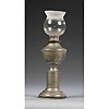 unmarked, American, 19th century, nickel-plated brass footed lamp with urn-shaped font and clear-to-frosted open top shade; set into base is a wing-n...