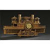 a key-wind clock inset in a steamboat-form and elaborate fretwork case resting on a fretwork stand. When the clock runs, the arms on deck and the side wheel move. The ship is named A.M.S. above the clock. In its original finish, likely early 20th century; 11.5 high x 24.5" long. Condition report A few minor losses, some loose pieces still present, may have been smokestack finials; we do not guarantee the working order of clocks.
