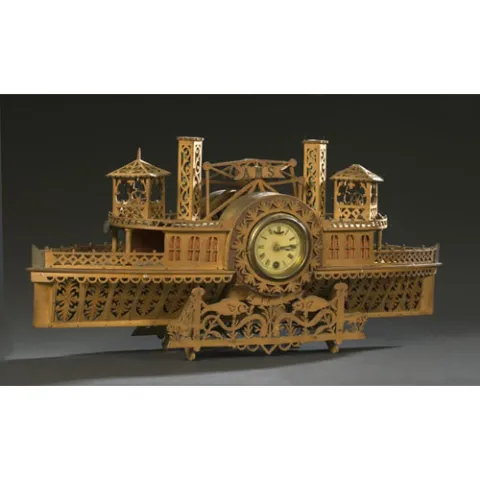 Folk Art Fretwork Steamboat with Clock, a key-wind clock inset in a steamboat-form and elaborate fretwork case resting on a fretwork stand. When the clock runs, the arms on deck and the side wheel move. The ship is named A.M.S. above the clock. In its original finish, likely early 20th century; 11.5 high x 24.5" long. Condition report A few minor losses, some loose pieces still present, may have been smokestack finials; we do not guarantee the working order of clocks.