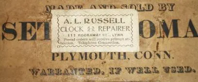 C.1849, Birge, Peck and Co., Bristol, double deck, carved column and splat, 8-day strap brass movement, and Puffin' Betsy label.