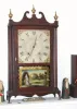 Condition: overall very good condition, with a replaced upper door. An unusually late use of this case style with a brass movement. Sheldon did a nice job of making the top door, but the mahogany has a more open grain and the color is slightly off. Fruit basket splat is original with especially nice detail. Robust ribbed strap brass movement is unsigned but typical of what Birge and Peck used in their shelf clocks. Label is faded a bit, some tears, but still legible. Height 36 inches