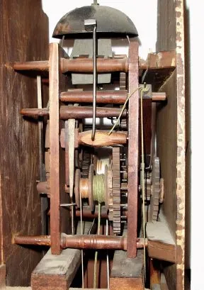 Condition: except for the replaced finials, excellent overall original condition. The painted dial is excellent with good paint retention. Retains original tin can weights and wood stick pendulum. The plinth of the case has a vertical crack. When he was living, Mr. Hoch wound this clock daily. Height 93 inches