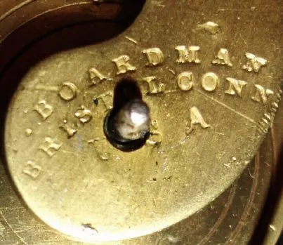 C.1848, Wm. S. Johnson, 16 Courtlandt St, New York, mini bevel front, 1-day, double fusee, with separate alarm mov't on base. Condition: the wooden dial has margin chips and minor loss, overall xlnt; label is good, fantastic eagle tablet, and exterior with original orange peel finish. One minor fault, easily corrected, is that someone added a thin brass wheel to the rear of the strike fusee to keep the cord from wandering off when wound down. Signed Boardman mov't. Height 17.7 inches