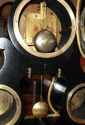 C.1880, French, Monumental 3-dial, perpetual calendar clock, the large bell strike movement signed GV, and with oversize brocot escapement on the large 7.5" dial, and with separate calendar and barometer indications, and central thermometer, with