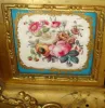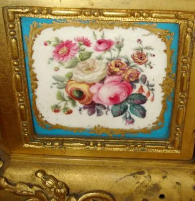 Condition: There are small applied ormolu decorations on the top and bottom right of the clock that are missing. The bezel is loose because the brass retaining ring on the back of the clock is absent. The porcelain dial is signed "Vernet" and has chips around the two winding arbors. The 3 porcelain inserts are in xlnt condition and the case has most of its gilding intact. Height 15 inches