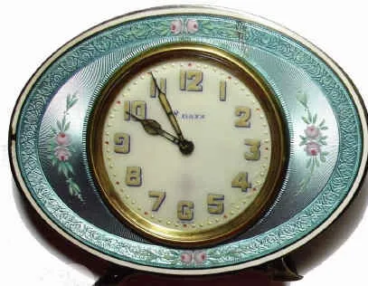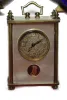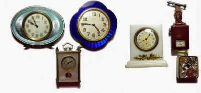 (4) table clocks and (1) lapel watch / clock; two (2) 8-day clocks in gilt cases with silver and guilloche enamel frames and collapsible stands, French KW KS in marble case 2 1/2"H, Swiss SW SS with automaton of dancing couple below dial in Mother-of-Pearl and gilt case 61mm H, and Mambo lady's lapel watch / music box in outer red leather case and gilt inner case and in addition one modern miniature music box.