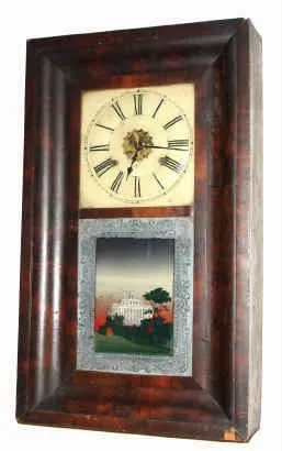C.1850, George March, Winchester, Conn, 30 hour brass works OG, mahogany veneer, 2-wt. Condition: overall very good original condition; small veneer flake along bottom molding, good dial; super original tablet of a Federal style building. Gd label. Ht 26"