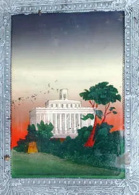 Condition: overall very good original condition; small veneer flake along bottom molding, good dial; super original tablet of a Federal style building. Gd label. Ht 26"