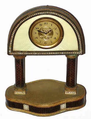 C.1920 Swiss, 8-day desk or boudoir clock, with some distress. Condition: Enameled case is in good condition, but has taken a fall and the columns and top support are a bit crooked; rear dust cover is absent. Yellow guilloche enamel over silver around the dial is still fine, and overall the case represents a lot of hand enamel work. 6 jewel movement complete. Ht 6.5"