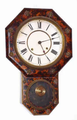 C.1900, Japanese, 8-day time/strike wall clock. Condition: Faux-tortoise shell grained case in very clean condition. Dial paper a replacement. Dial pan has become partially separated from its bezel. Hands are original. Runs and strikes. Ht. 22"