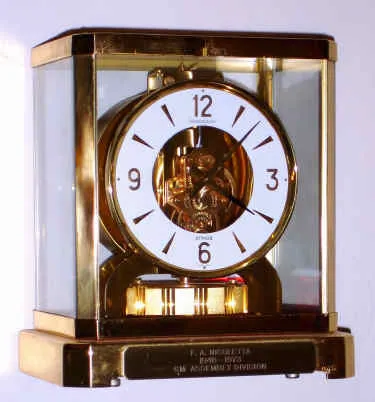 C.1973 [dated], Swiss, LeCoultre, ATMOS, or self winding, perpetual running clock, Calibre 528-8, with lift-out front glass, serial No. 381580. A presentation to F. A. Nicoletta, for 25 years of service, 1948-1973, GM Assembly Division.