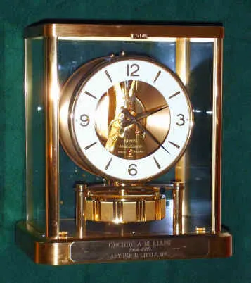 C.1990, Swiss, LeCoultre, ATMOS, or self winding, perpetual running clock, wound by changes in temperature and pressure, serial 626644. A presentation to Orchidea Liani for 25 years of service to Arthur Little, Inc.