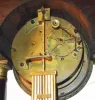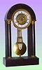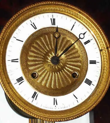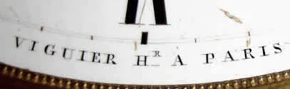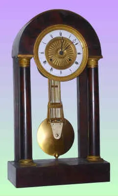 C.1860, French, Viguier, Hr., Paris, Empire style mantel clock with gilt grid-iron pendulum, longer duration /?. Condition: the porcelain dial has cracks and hairlines on the left side. Mahogany veneer case has some splits in the veneer and minor loss to the rear. Note 2 front pillars are round with gilt capitals, rear two are just pilasters. No signature on large count-wheel movement, probably goes for 30 days. Ht 18"