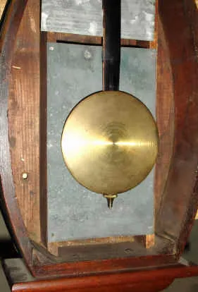Condition: old glass tablet has been broken and taped in place, dial is new, lead weight home made, pendulum is from a ST No. 2. Still an interesting case style that does not occur that often, and restoration will be straight forward. Ht 31"