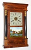 Condition: Refinished mahogany veneered case in good condition with a couple of minor veneer chips and a small repair. Columns have been repainted black/gold. Tablet is a replacement. Original painted dial has minor loss and some scratches. Hands are original. Ht. 25"