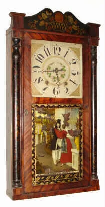 Condition: Partially refinished mahogany veneered case in fairly nice condition with some minor repairs on the base and most of the stenciling intact. Original tablet of a print applied to glass has some losses (holes) . Dial appears to be original and hands are period. Ht. 32"