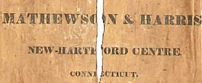 C.1837, Mathewson and Harris, New Hartford Centre, Conn., 30-hour time/strike wood movement half column and splat shelf clock. Condition: Partially refinished mahogany veneered case in fairly nice condition with some minor repairs on the base and most of the stenciling intact. Original tablet of a print applied to glass has some losses (holes) . Dial appears to be original and hands are period. Ht. 32"