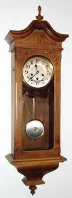 C.1900, German, Junghans, 8-day Westminster chime Vienna style wall clock in a case with baroque influence. Condition: Refinished walnut case in nice condition.. Original silvered dial is very clean, however, there are dings in the brass bezel near 9.. Hands are original. Running and chiming Ht. 41"