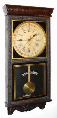 C.1915, Waterbury Clock Co., 8-day calendar wall timepiece, store regulator case. Label on the back reads: "A and W Regulator, New York". It appears that A and W was buying clocks from Waterbury and placing their label on the back.