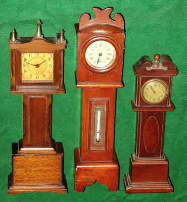 Lot of 3 Mini Tall clocks: 1) Burroughs No. 54T Grandfather, mahogany, with Gilbert 30 hour rear wind / set movement; 2) Well made mahogany case with flip up top for inserting an Ansonia Bee; remove to wind and set, and 3) a smaller mahogany segmented case with rear wind and set movement, missing set stem. Hts 11-14"