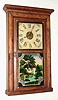 C.1845, E. C. Brewster and Co.?, 30-hour iron backplate movement shelf clock. Condition: Poor to fair. Veneer on the door, case sides and front has been stripped off. Original painted dial has numerous flaked areas that have been inpainted. Hands are original. Foto-copied "card" label inside. Repainted tablet well done; would be $85 alone. Glasses held in place with glue and tacks, since retainer strip is absent. Ht. 23.5"