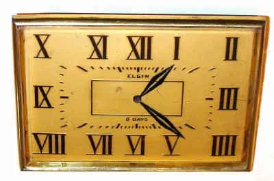 C.1920, Elgin Watch Co, 8-day jeweled lever desk clock, in a rectangular Deco style case with raised and gilt Roman numerals. Condition: the crystal has a few scratches, but is not chipped; gilt dial is still good; hands original. Balance staff is good and movement ticks and stops. Expensive when new. Ht 3.5"