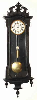 C.1880, Germany, H Endler and Company., Freiburg, 8-day Vienna style regulator timepiece, 1-weight.. Condition: Ebonized case in clean condition with some wear to the original finish. Top trim is new, made up of various hobby parts, bottom bracket sprayed black. Porcelain dial is perfect and hands are original Spun brass dial bezel has some dents. Pendulum bob has some dents and dings. Finials are modern. Empty holes in case back near top. Interestingly, this movement has 40 teeth in the escape wheel, and thus the seconds bit does rotate once a minute [unlike Beckers] Old front glass. Ht. 42"